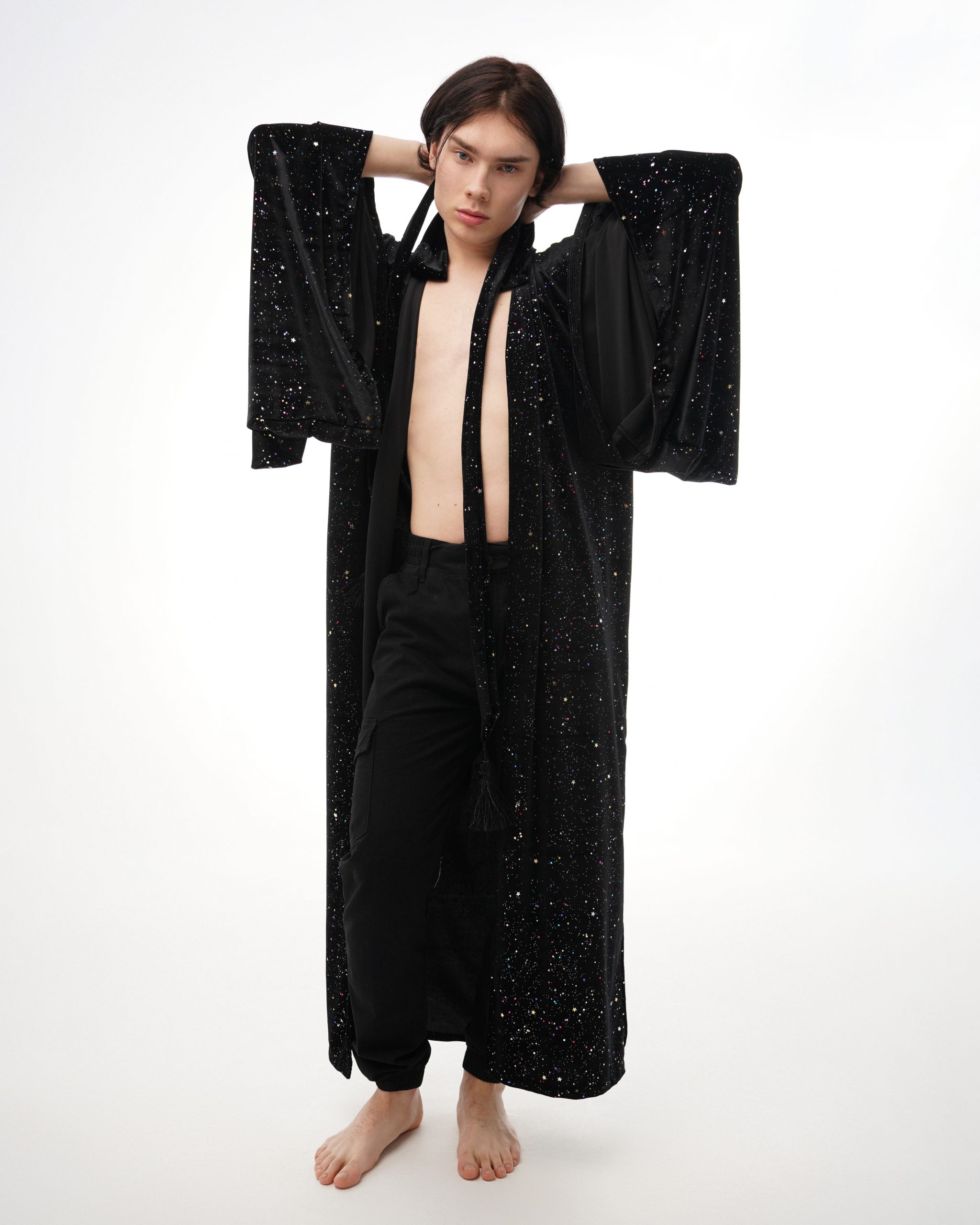A garment born of galaxies, Stardust Velvet channels celestial allure in every stitch. Draped in soft black velvet and dusted with constellations of shimmer, this kimono is made for those who live between dreams and daylight. Whether floating through a rooftop soirée or lounging under moonlight, it’s an invitation to glow unapologetically.